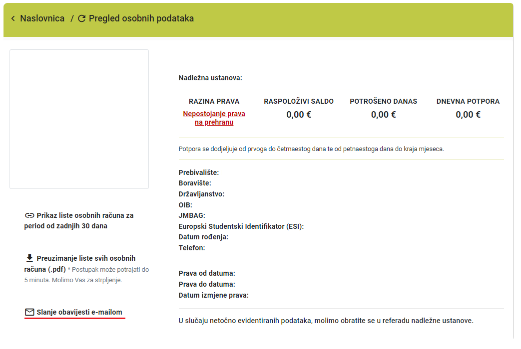 Omogućavanje eRačuna je jednostavan proces koji od studenta zahtjeva prijavu na ISSP portal i odabir opcije „Slanje obavijesti“ koja se nalazi s lijeve strane osobnih podataka, slika 1.