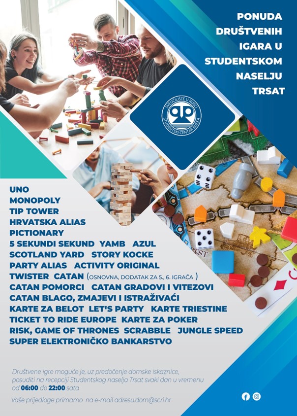 Društvene igre moguće je, uz predočenje domske iskaznice, posuditi na recepciji Studentskog naselja Trsat. U Studentskom naselju Trsat u ponudi imamo društvene igre: